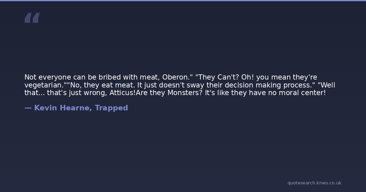 Not everyone can be bribed with meat, Oberon." "They Can't? Oh! you mean they're vegetarian.""No, they eat meat. It just doesn't sway their decision making process." "Well that... that's just wrong, Atticus!Are they Monsters? It's like they have no moral center!