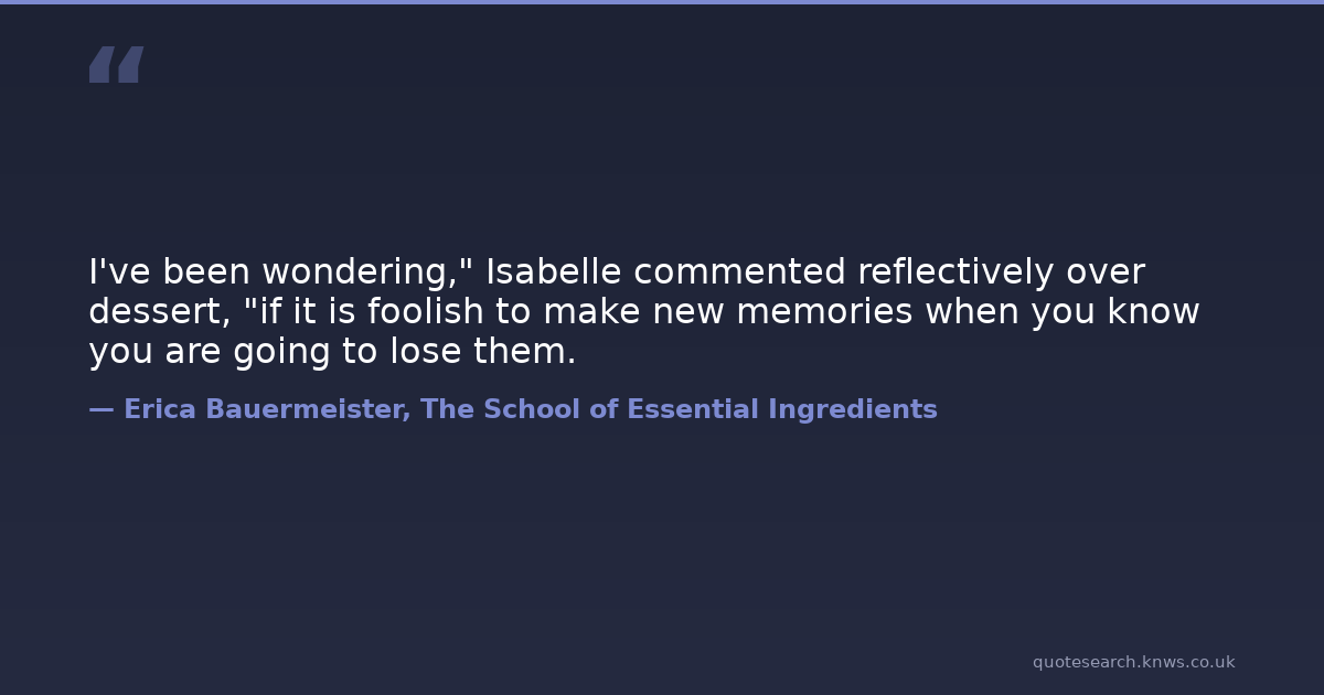 I've been wondering," Isabelle commented reflectively over dessert, "if it is foolish to make new memories when you know you are going to lose them.