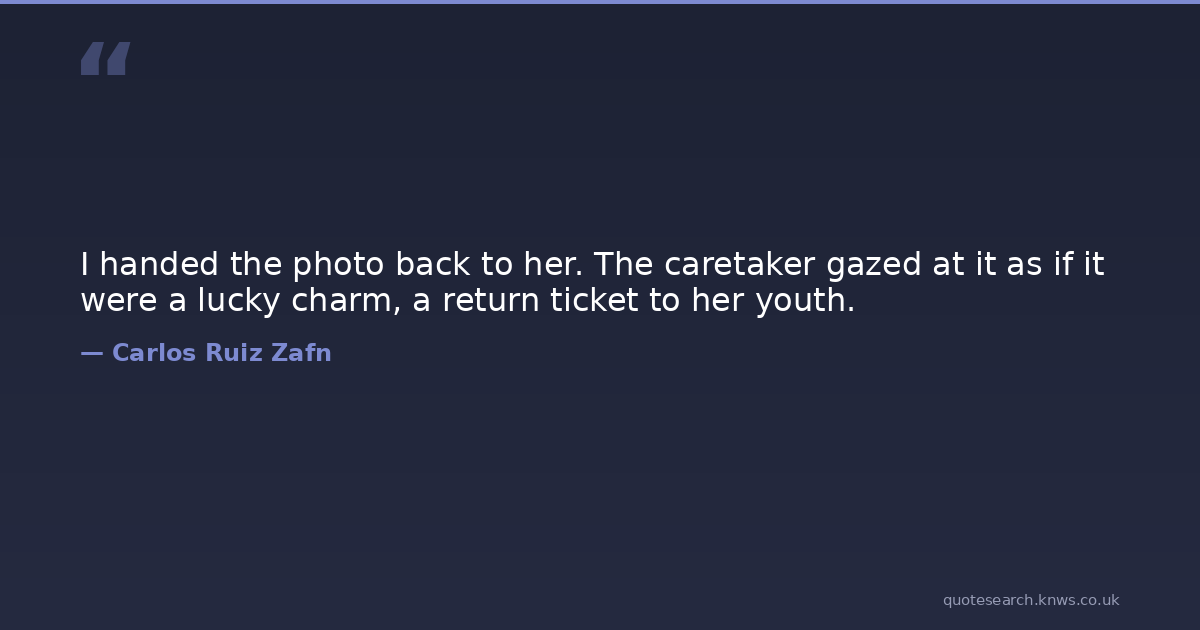 I handed the photo back to her. The caretaker gazed at it as if it were a lucky charm, a return ticket to her youth.