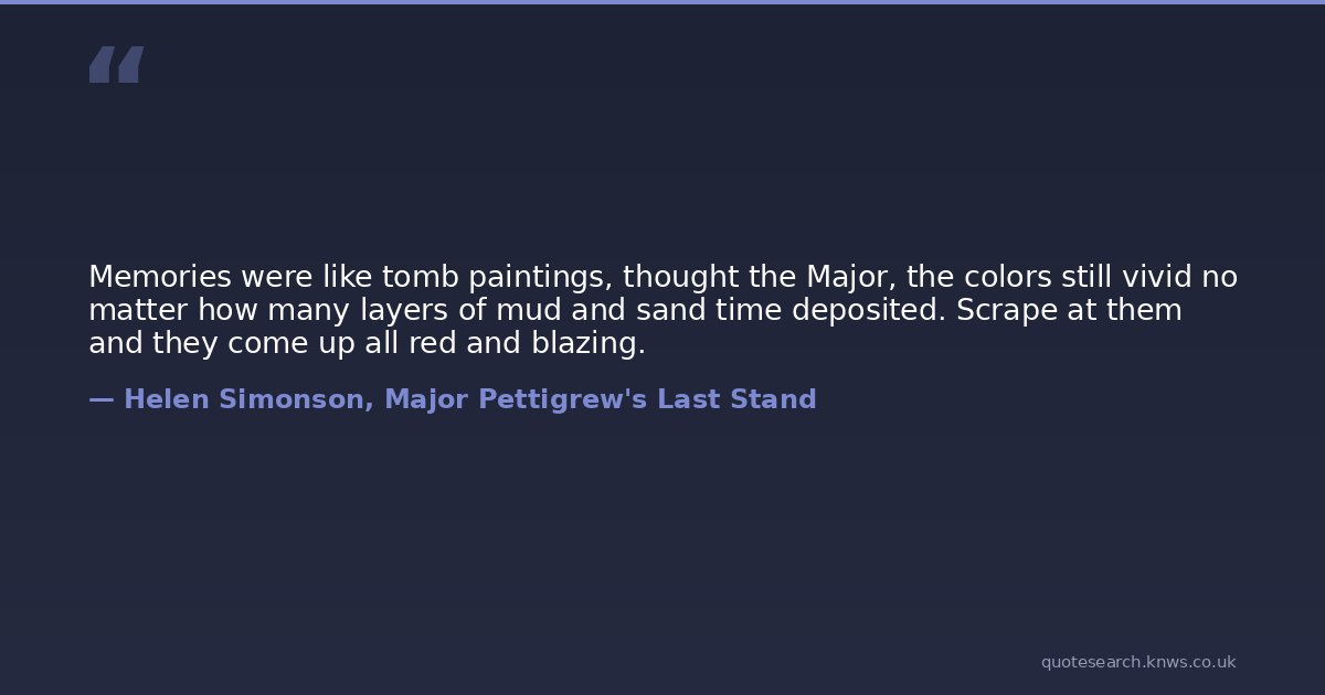 Memories were like tomb paintings, thought the Major, the colors still vivid no matter how many layers of mud and sand time deposited. Scrape at them and they come up all red and blazing.