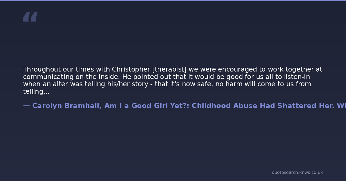 Throughout our times with Christopher [therapist] we were encouraged to work together at communicating on the inside. He pointed out that it would be good for us all to listen-in when an alter was telling his/her story - that it's now safe, no harm will come to us from telling or from knowing. There was once a time when it was very important that we didn't know what had happened; that knowing meant danger or being so overwhelmed with pain and grief that we wouldn't survive. But now it was different. We're safe and strong, and our goal now are to uncover the grisly truth of what's happened to us, so that it's no longer a powerful secret. We can look at it and face the past for what it is - old memories of old events. Today is now,and we can choose to live a different way and believe different things. We were once powerless and vulnerable, but now we were in a position to make choices. We had control over our life.