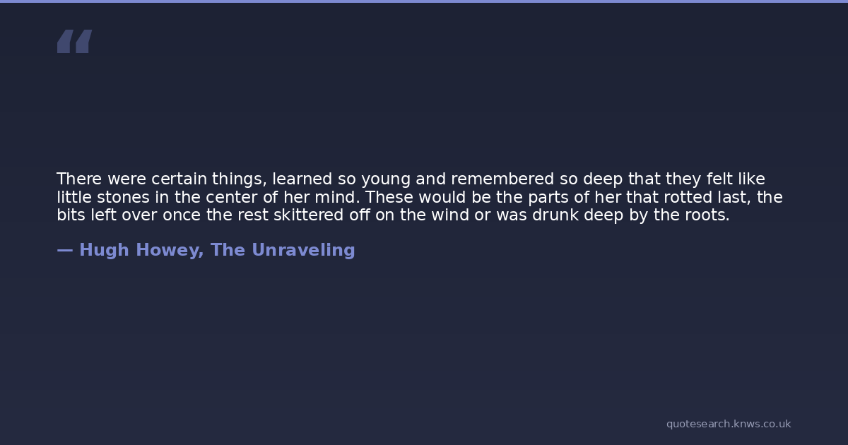 There were certain things, learned so young and remembered so deep that they felt like little stones in the center of her mind. These would be the parts of her that rotted last, the bits left over once the rest skittered off on the wind or was drunk deep by the roots.