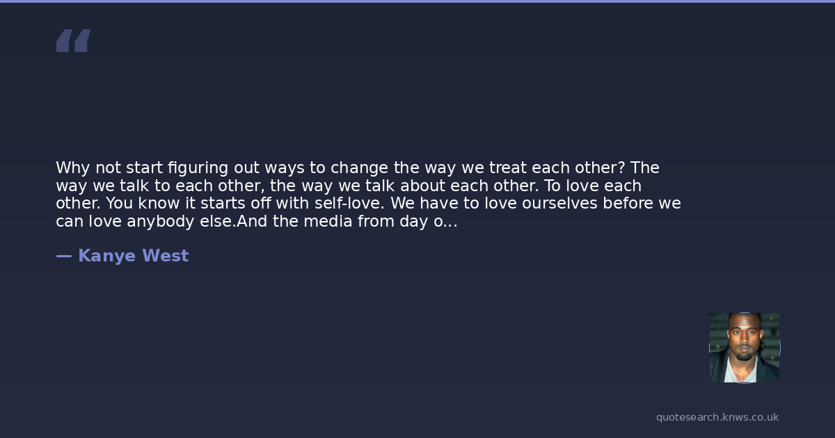 Why not start figuring out ways to change the way we treat each other? The way we talk to each other, the way we talk about each other. To love each other. You know it starts off with self-love. We have to love ourselves before we can love anybody else.And the media from day one, from when you were little ass kids, they teach you not to love yourself. They take something out of you and they try to sell it back to you... Something that youve been fighting for your entire life thats taken from you as a child. That you always had inside of you. Thats self-love.That's why I love you so much, cause as everybody knows, I love me so much.The greatest gift you have is your nowyou dont know whats going to happen tomorrow and the past is the past.