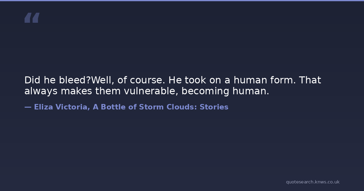 Did he bleed?Well, of course. He took on a human form. That always makes them vulnerable, becoming human. bleed human vulnerable Download Image Share on X Share on Facebook Copy Link