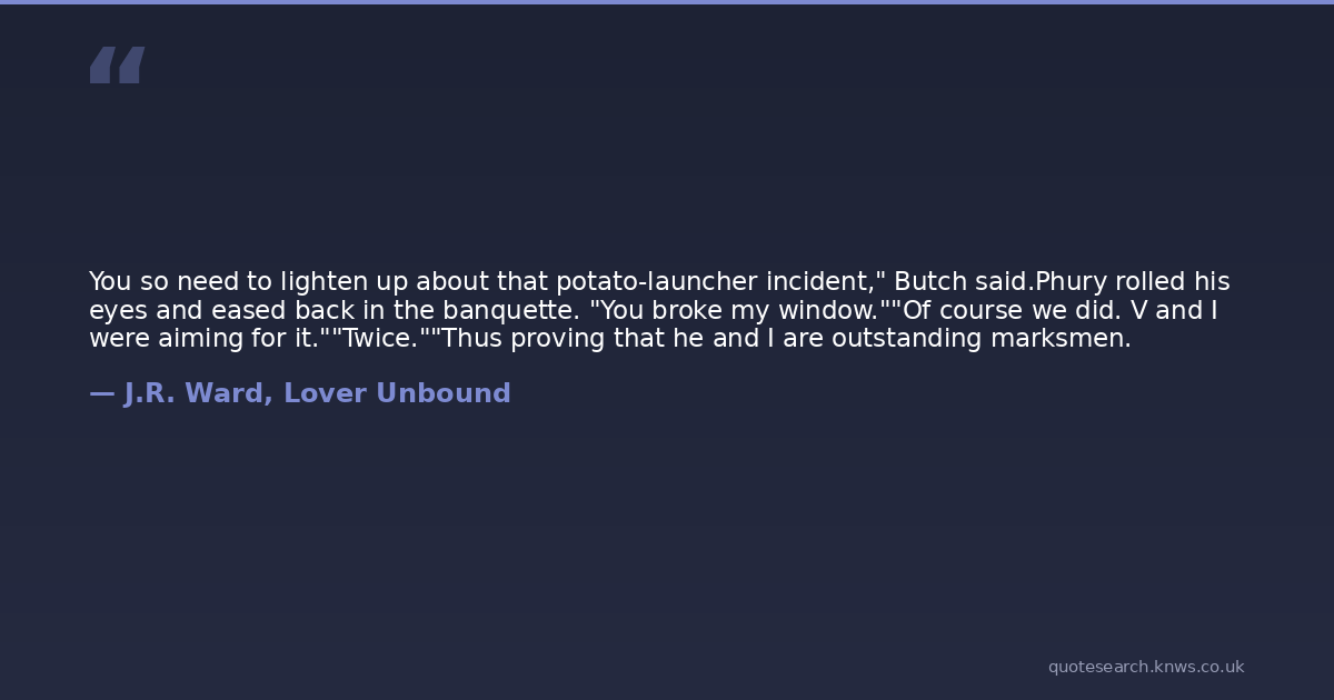 You so need to lighten up about that potato-launcher incident," Butch said.Phury rolled his eyes and eased back in the banquette. "You broke my window.""Of course we did. V and I were aiming for it.""Twice.""Thus proving that he and I are outstanding marksmen.