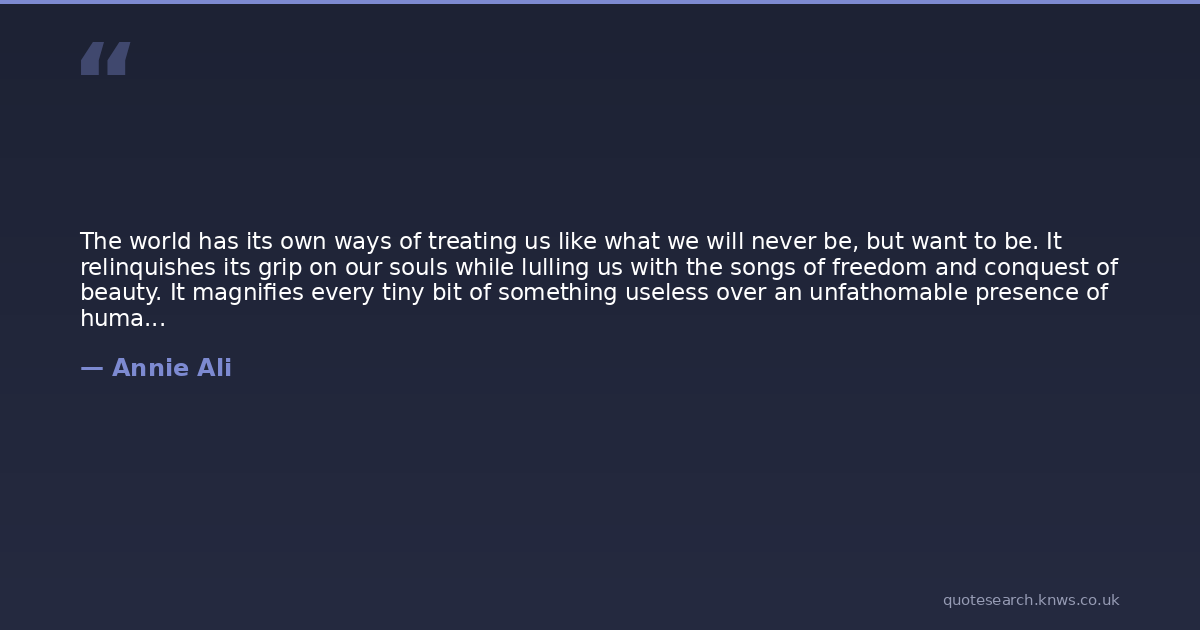 The world has its own ways of treating us like what we will never be, but want to be. It relinquishes its grip on our souls while lulling us with the songs of freedom and conquest of beauty. It magnifies every tiny bit of something useless over an unfathomable presence of humanity. And we all waste the whole of our lives standing in queue for gaining its attention to be abdicated as if we never existed in the eyes of our fellow men.