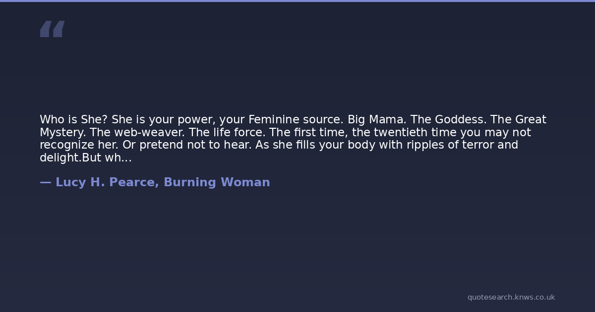 Who is She? She is your power, your Feminine source. Big Mama. The Goddess. The Great Mystery. The web-weaver. The life force. The first time, the twentieth time you may not recognize her. Or pretend not to hear. As she fills your body with ripples of terror and delight.But when she calls you will know youve been called. Then it is up to you to decide if you will answer.