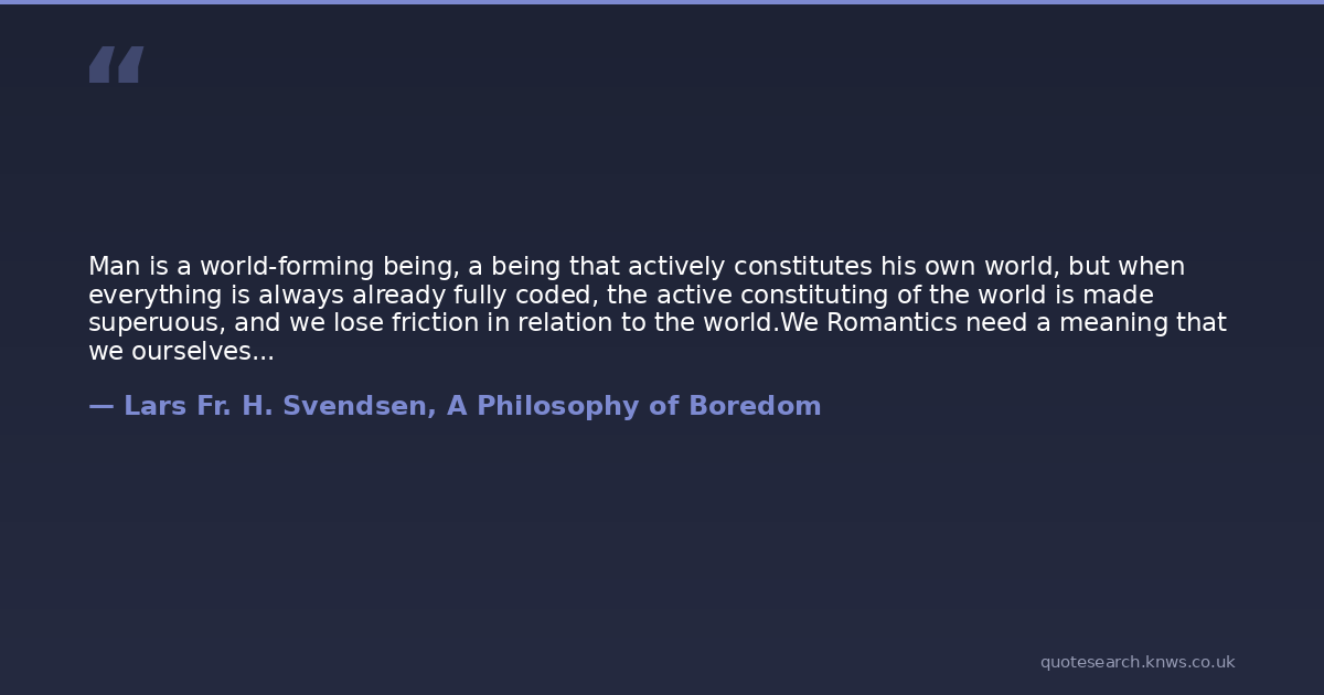 Man is a world-forming being, a being that actively constitutes his own world, but when everything is always already fully coded, the active constituting of the world is made superuous, and we lose friction in relation to the world.We Romantics need a meaning that we ourselves realize and the person who is preoccupied with self-realization inevitably has a meaning problem. This is no one collective meaning in life any more, a meaning that it is up to the individual to participate in. Nor is it that easy to find an own meaning in life, either. The meaning that most people embrace is self-realization as such, but it is not obvious what type of self is to be realized, nor whatshould possibly result from it. The person who is certain as regards himself will not ask the question as to who he is. Only a problematic self feels the need for realization.