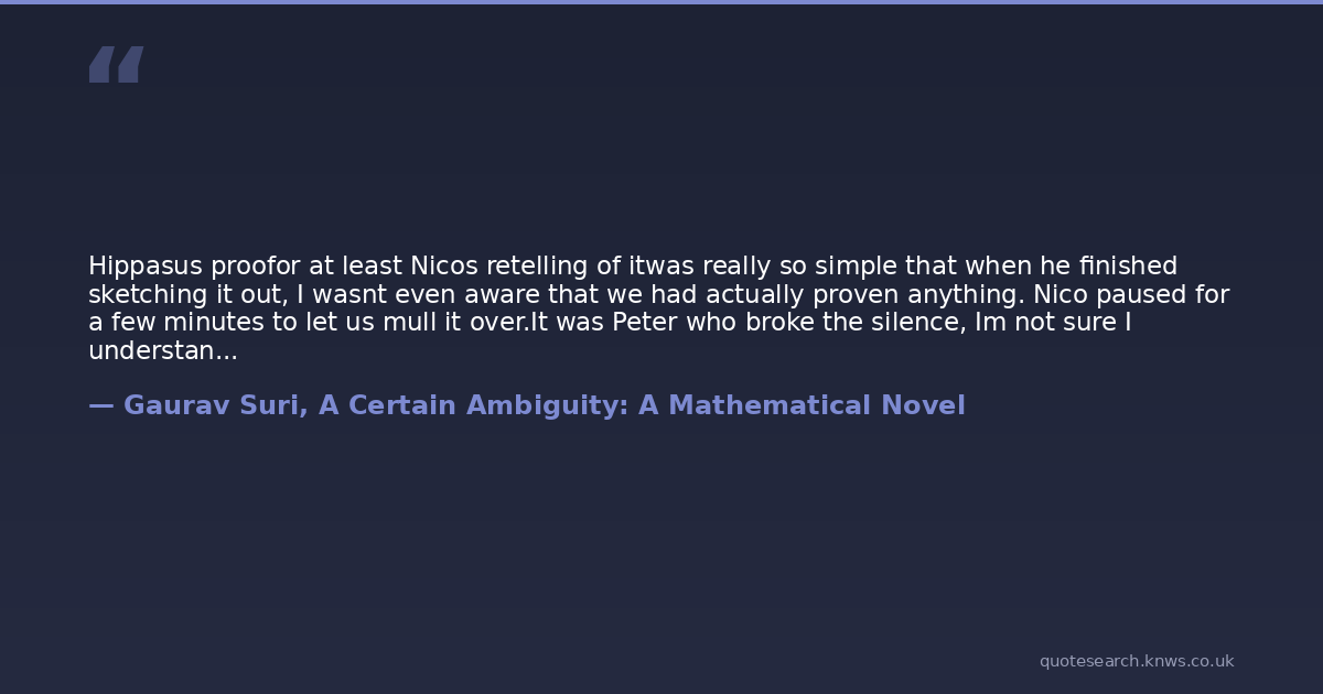 Hippasus proofor at least Nicos retelling of itwas really so simple that when he finished sketching it out, I wasnt even aware that we had actually proven anything. Nico paused for a few minutes to let us mull it over.It was Peter who broke the silence, Im not sure I understand what we have done.Nico seemed to be expecting such a response. Step back and examine the proof; in fact, you should try and do this with every proof you see or have to work out for yourself. ..."He again waited for his words to sink in, and it began to make sense for me. All my mathematics teachers (other than Bauji and Nico) always seemed to evade this part of their responsibility. They had been content to merely write out a proof on the blackboard and carry on, seemingly without concern for what the proof meant and what it told us.But you should not stop here. Even when you have understood a proof, and I hope you have indeed understood this proof, ask yourself the next question, the obvious one, but as critical: So what? Or, why are we proving this? What is the point? What is the context? How does it relate to us? To answer these questions we have to step back a little. Let me show youits really quite delightful. Now there was excitement in Nicos voice.