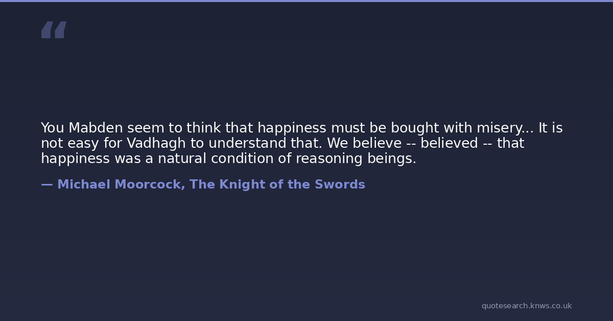 You Mabden seem to think that happiness must be bought with misery... It is not easy for Vadhagh to understand that. We believe -- believed -- that happiness was a natural condition of reasoning beings.