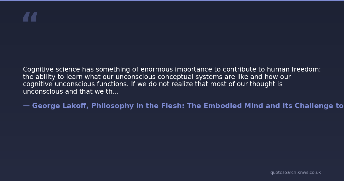 Cognitive science has something of enormous importance to contribute to human freedom: the ability to learn what our unconscious conceptual systems are like and how our cognitive unconscious functions. If we do not realize that most of our thought is unconscious and that we think metaphorically, we will indeed be slaves to the cognitive unconscious. Paradoxically, the assumption that we have a radically autonomous rationality as traditionally conceived actually limits our rational autonomy. It condemns us to cognitive slavery - to an unaware and uncritical dependence on our unconscious metaphors. To maximize what conceptual freedom we can have, we must be able to see through and move beyond philosophies that deny the existence of an embodied cognitive unconscious that governs most of our mental lives.