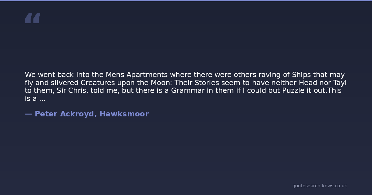 We went back into the Mens Apartments where there were others raving of Ships that may fly and silvered Creatures upon the Moon: Their Stories seem to have neither Head nor Tayl to them, Sir Chris. told me, but there is a Grammar in them if I could but Puzzle it out.This is a mad Age, I replied, and there are many fitter for Bedlam than these here confin'd to a Chain or a dark Room.A sad Reflection, Nick.And what little Purpose have we to glory in our Reason, I continu'd, when the Brain may so suddenly be disorder'd?