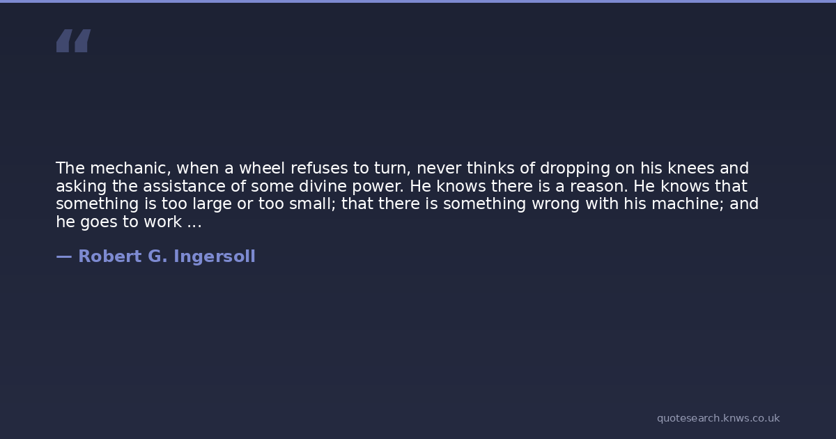 The mechanic, when a wheel refuses to turn, never thinks of dropping on his knees and asking the assistance of some divine power. He knows there is a reason. He knows that something is too large or too small; that there is something wrong with his machine; and he goes to work and he makes it larger or smaller, here or there, until the wheel will turn.