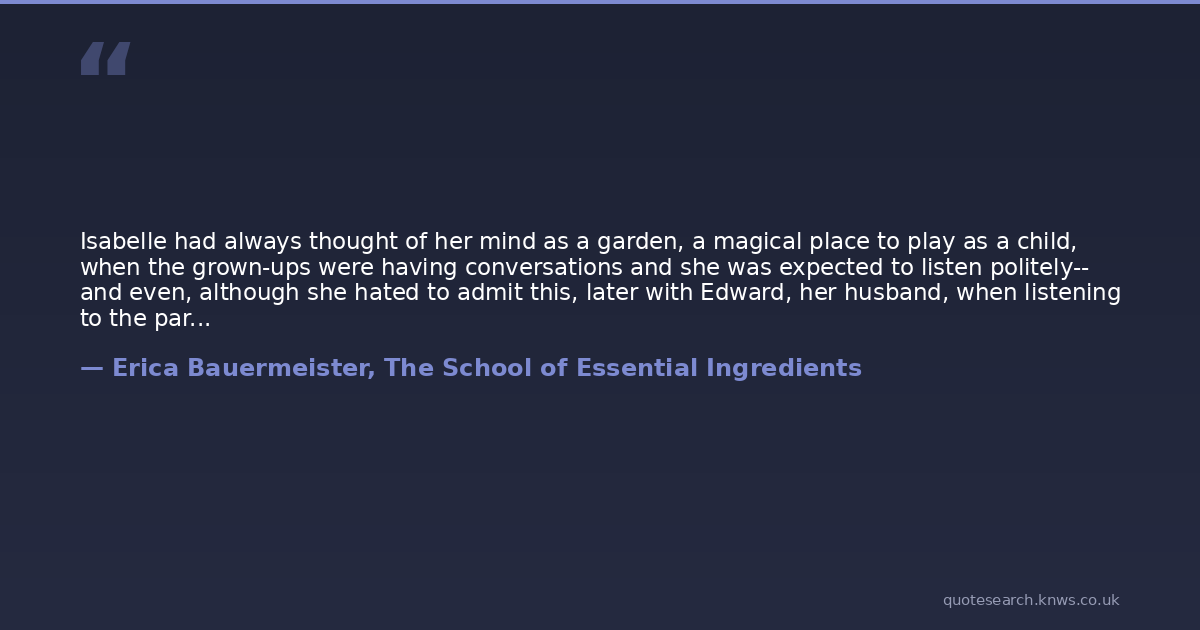 Isabelle had always thought of her mind as a garden, a magical place to play as a child, when the grown-ups were having conversations and she was expected to listen politely-- and even, although she hated to admit this, later with Edward, her husband, when listening to the particularities of his carpet salesmanship wore her thin. Every year the garden grew larger, the paths longer and more complicated. Meadows of memories.Of course, her mental garden hadn't always been well tended. There were the years when the children were young, fast-moving periods when life flew by without time for the roots of deep reflection, and yet she knew memories were created whether one pondered them or not. She had always considered that one of the luxuries of growing older would be the chance to wander through the garden that had grown while she wasn't looking. She would sit on a bench and let her mind take every path, tend every moment she hadn't paid attention to, appreciate the juxtaposition of the one memory against another.