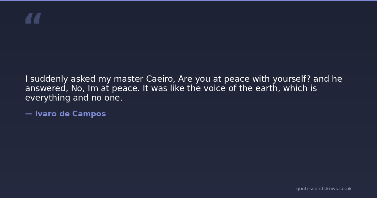 I suddenly asked my master Caeiro, Are you at peace with yourself? and he answered, No, Im at peace. It was like the voice of the earth, which is everything and no one.