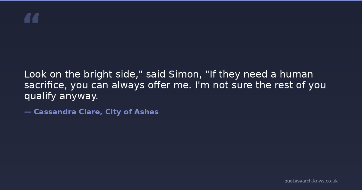 Look on the bright side," said Simon, "If they need a human sacrifice, you can always offer me. I'm not sure the rest of you qualify anyway.