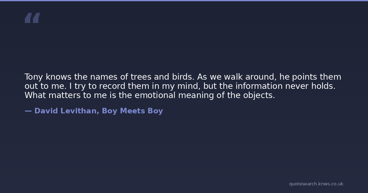 Tony knows the names of trees and birds. As we walk around, he points them out to me. I try to record them in my mind, but the information never holds. What matters to me is the emotional meaning of the objects.