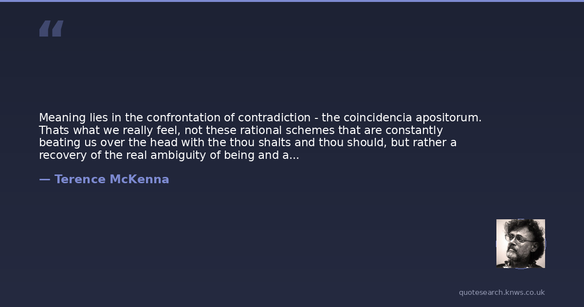 Meaning lies in the confrontation of contradiction - the coincidencia apositorum. Thats what we really feel, not these rational schemes that are constantly beating us over the head with the thou shalts and thou should, but rather a recovery of the real ambiguity of being and an ability to see ourselves as at once powerful and weak, noble and ignoble, future-oriented, past-facing.