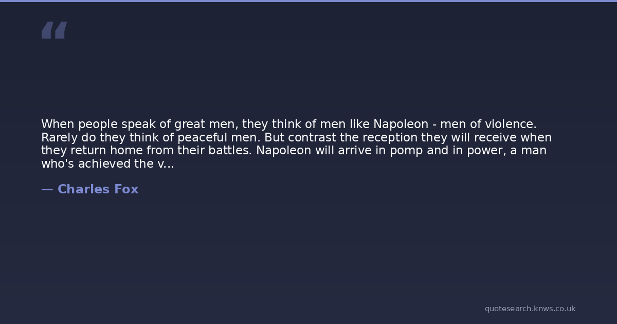 When people speak of great men, they think of men like Napoleon - men of violence. Rarely do they think of peaceful men. But contrast the reception they will receive when they return home from their battles. Napoleon will arrive in pomp and in power, a man who's achieved the very summit of earthly ambition. And yet his dreams will be haunted by the oppressions of war. William Wilberforce, however, will return to his family, lay his head on his pillow and remember: the slave trade is no more.
