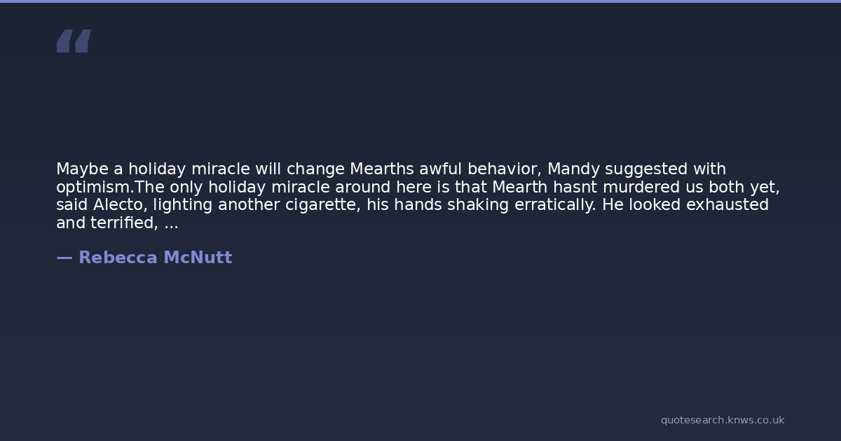 Maybe a holiday miracle will change Mearths awful behavior, Mandy suggested with optimism.The only holiday miracle around here is that Mearth hasnt murdered us both yet, said Alecto, lighting another cigarette, his hands shaking erratically. He looked exhausted and terrified, his gray eyes soulless.Do you know what Mearth likes, Alecto? Mandy questioned.Vegetables, she likes celery a lot, and lettuce, Alecto responded in a quiet monotone. I dont know what else she likes. Ive never asked her.Well, she has to like something doesnt everyone?Not her, Mandy Valems.