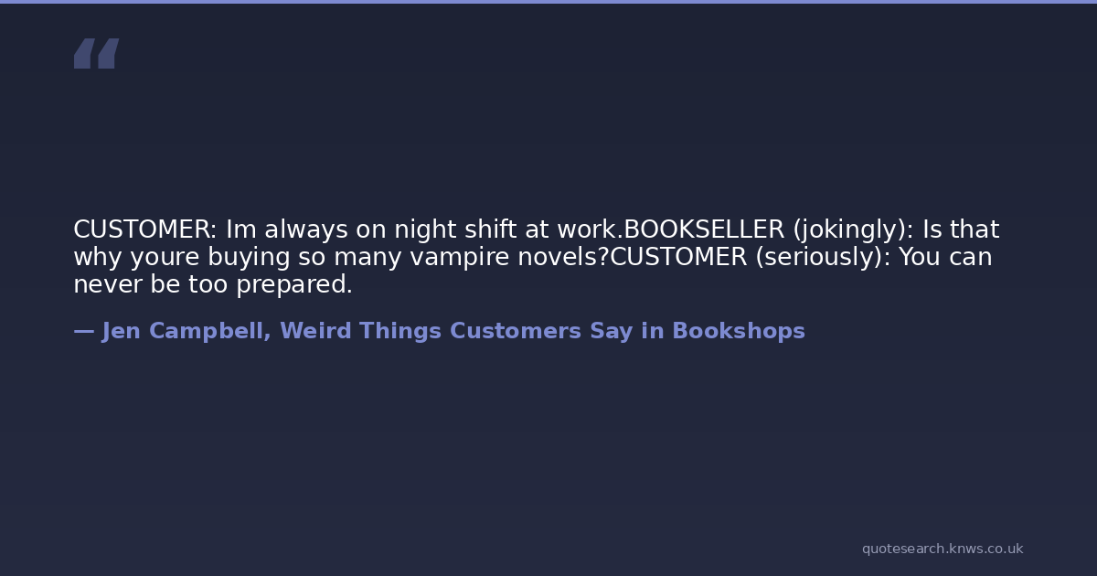 CUSTOMER: Im always on night shift at work.BOOKSELLER (jokingly): Is that why youre buying so many vampire novels?CUSTOMER (seriously): You can never be too prepared.