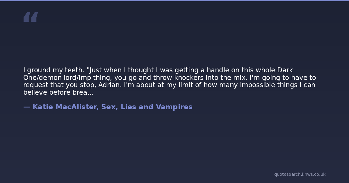 I ground my teeth. "Just when I thought I was getting a handle on this whole Dark One/demon lord/imp thing, you go and throw knockers into the mix. I'm going to have to request that you stop, Adrian. I'm about at my limit of how many impossible things I can believe before breakfast."He flashed a heart-stoppingly roguish grin at me, his dimples just about bringing me to my knees. "Your middle name wouldn't be Alice, would it?" he asked."No, it's Diane, and you're no White Rabbit, so let's just stop pretending we're in Wonderland, OK?"He laughed and pointed across the tiny square at our destination. I watched him for a moment, seeing a glimpse of the charming, charismatic man he must have been before the demon lord cursed him and leeched away all the softer emotions.