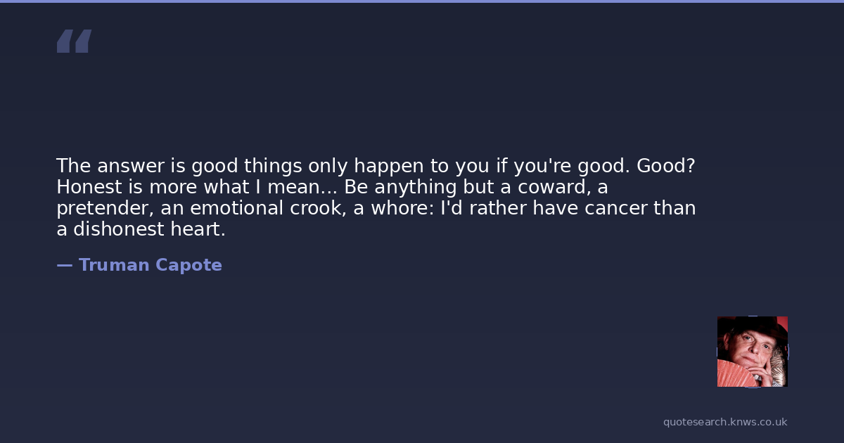 The answer is good things only happen to you if you're good. Good? Honest is more what I mean... Be anything but a coward, a pretender, an emotional crook, a whore: I'd rather have cancer than a dishonest heart.