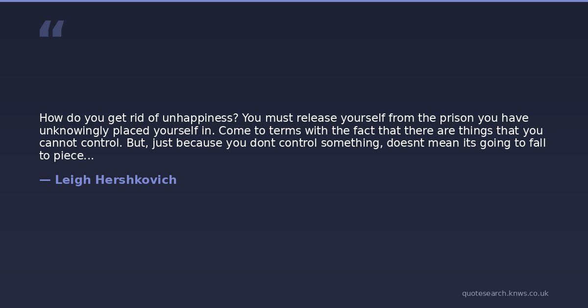 How do you get rid of unhappiness? You must release yourself from the prison you have unknowingly placed yourself in. Come to terms with the fact that there are things that you cannot control. But, just because you dont control something, doesnt mean its going to fall to pieces. That may be the hardest part. We get bent out of shape when something happens that is out of our control, because we dont understand why its happening or where its coming from. Its unsettling. You put your fighting arms up and prepare to battle the world. But, stop for a moment. Think. Where are all of these things coming from?The world is not a wild, untamed place, where things are a free for all. Understand that there is a higher power running the world.