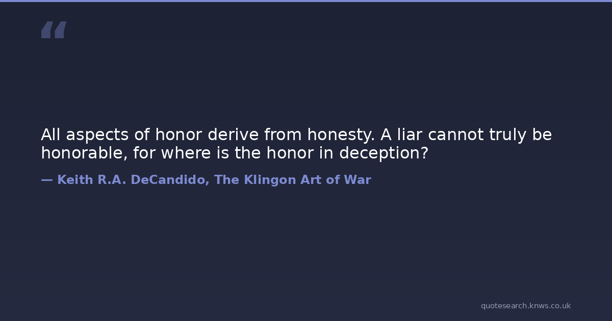 All aspects of honor derive from honesty. A liar cannot truly be honorable, for where is the honor in deception? honesty honor Download Image Share on X Share on Facebook Copy Link