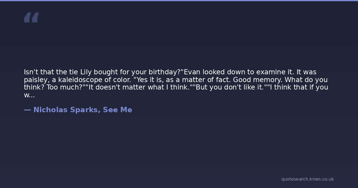 Isn't that the tie Lily bought for your birthday?"Evan looked down to examine it. It was paisley, a kaleidoscope of color. "Yes it is, as a matter of fact. Good memory. What do you think? Too much?""It doesn't matter what I think.""But you don't like it.""I think that if you want to wear it, you should wear it."Evan seemed momentarily undecided. "Why do you do that?""Do what?""Refuse to answer a simple question.""Because my opinion is irrelevant. You should wear what you want.""Just tell me, okay?""I don't like your tie.""Really? Why not?""Because it's ugly.""It's not ugly."Colin nodded. "Okay.""You don't know what you're talking about.""Probably.""You don't even wear ties.""You're right.""So why do I care what you think?""I don't know."Evan scowled. "Talking to you can be infuriating, you know.""I know. You've said that before.""Of course I've said it before! Because it's true! Didn't we just talk about this the other night? You don't have to say whatever pops into your head.""But you asked.""Just ... Oh, forget it." He turned and started back toward the house. "I'll talk to you later, okay?""Where are you going?"Evan walked a couple of steps before answering without turning around. "To change my damn tie. And by the way Margolis was right. Your face still looks like it was run through a meat grinder."Colin smiled. "Hey, Evan!"Evan stopped and turned. "What?""Thanks.""For what?""For everything.""Yeah, yeah. You're just lucky I won't tell Lily what you said.""You can if you'd like. I already told her."Evan starred. "Of course you did.