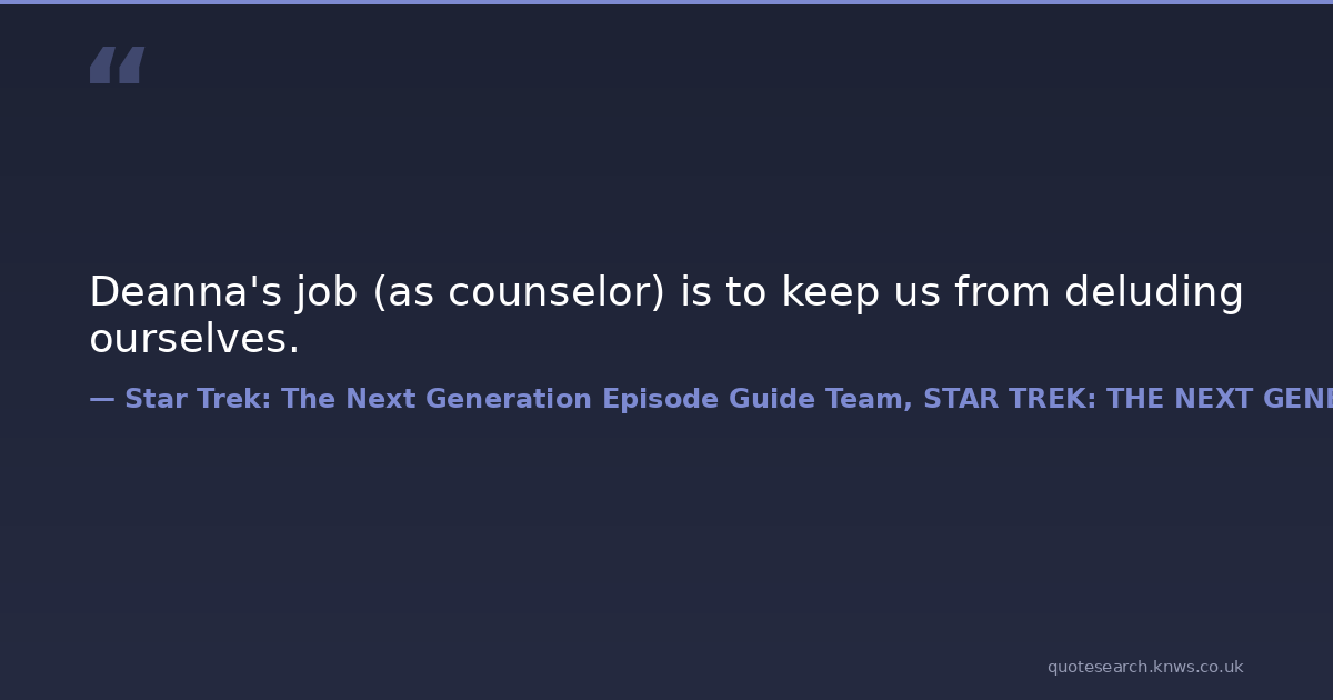 Deanna's job (as counselor) is to keep us from deluding ourselves. counseling honesty self-delusion Download Image Share on X Share on Facebook Copy Link