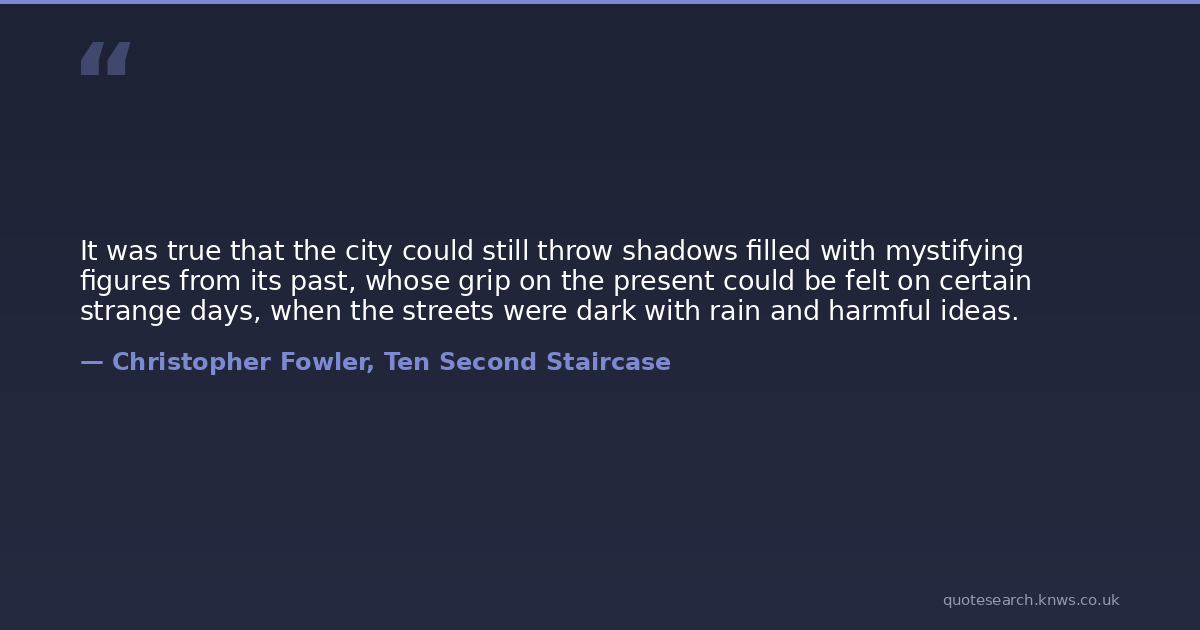 It was true that the city could still throw shadows filled with mystifying figures from its past, whose grip on the present could be felt on certain strange days, when the streets were dark with rain and harmful ideas.