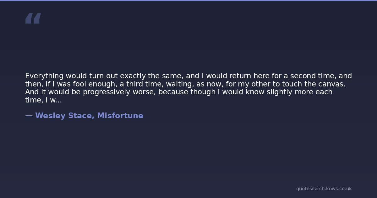 Everything would turn out exactly the same, and I would return here for a second time, and then, if I was fool enough, a third time, waiting, as now, for my other to touch the canvas. And it would be progressively worse, because though I would know slightly more each time, I would still be powerless to change my fate. Perhaps I would be unaware of the previous decision, yet choose again to come back. Or worse, I would become aware that I was inadvertently repeating the same mistake for a horrific split second just after I made the decision. Infinity was terrifying. Its abyss makes my skin crawl.