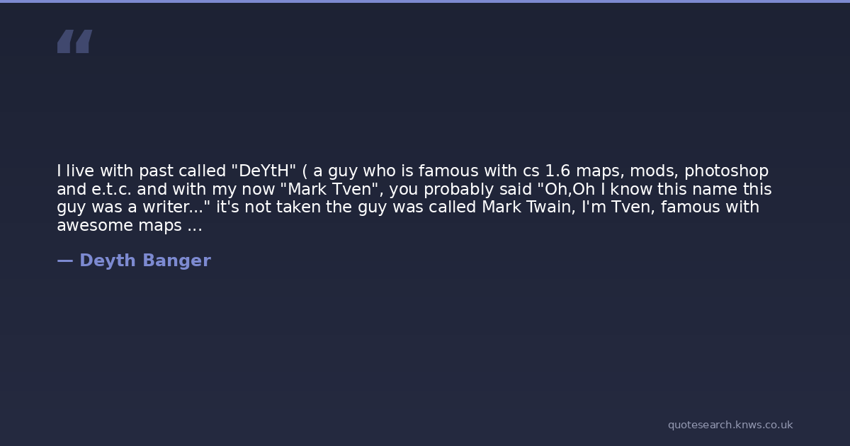 I live with past called "DeYtH" ( a guy who is famous with cs 1.6 maps, mods, photoshop and e.t.c. and with my now "Mark Tven", you probably said "Oh,Oh I know this name this guy was a writer..." it's not taken the guy was called Mark Twain, I'm Tven, famous with awesome maps and interesting updates of cs 1.6 maps. To don't forget, I'm famous with my nick of past with writting.