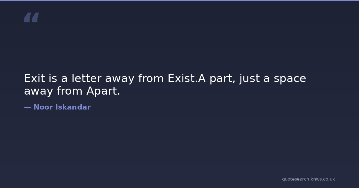 Exit is a letter away from Exist.A part, just a space away from Apart. death existence exit life Download Image Share on X Share on Facebook Copy Link
