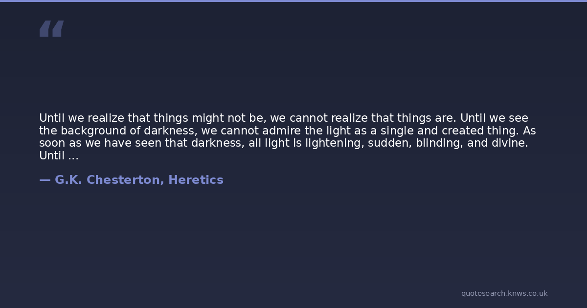 Until we realize that things might not be, we cannot realize that things are. Until we see the background of darkness, we cannot admire the light as a single and created thing. As soon as we have seen that darkness, all light is lightening, sudden, blinding, and divine. Until we picture nonentity we underrate the victory of God, and can realize none of the trophies of His ancient war. It is one of the million wild jests of truth that we know nothing until we know nothing.