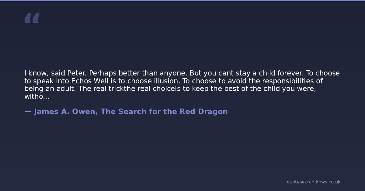 I know, said Peter. Perhaps better than anyone. But you cant stay a child forever. To choose to speak into Echos Well is to choose illusion. To choose to avoid the responsibilities of being an adult. The real trickthe real choiceis to keep the best of the child you were, without forgetting when you grow up.It is the best of both worlds, Jack. Being a child is to believe in magic everywherebut even Peter Pan had to grow up one day.