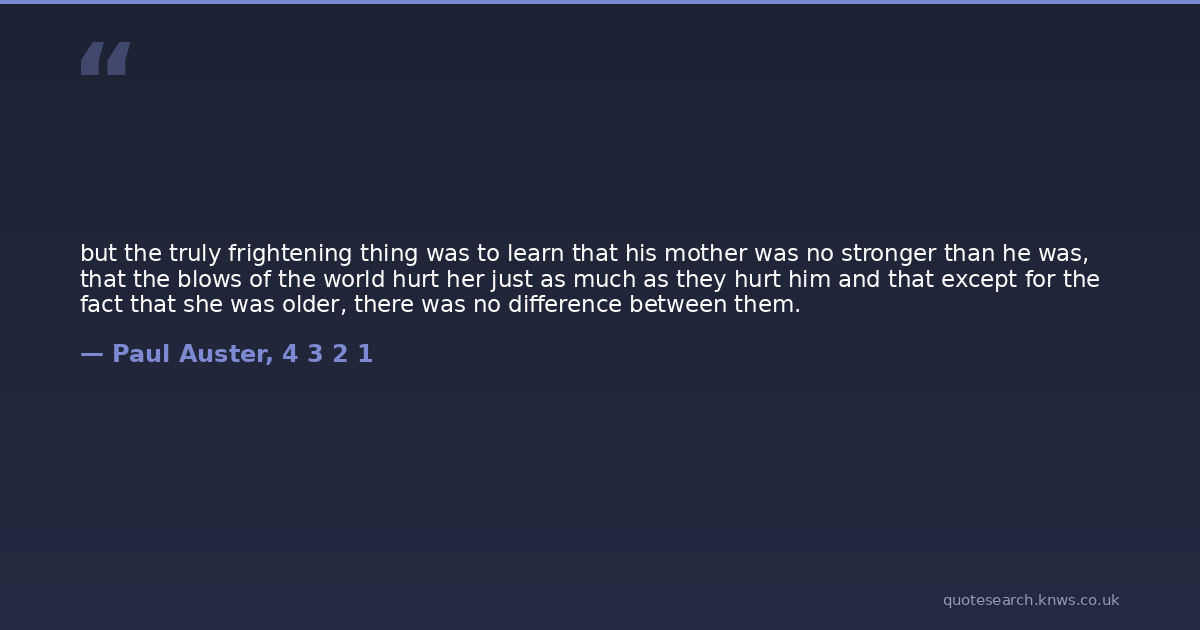 but the truly frightening thing was to learn that his mother was no stronger than he was, that the blows of the world hurt her just as much as they hurt him and that except for the fact that she was older, there was no difference between them.