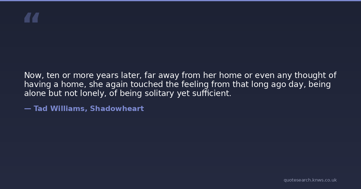 Now, ten or more years later, far away from her home or even any thought of having a home, she again touched the feeling from that long ago day, being alone but not lonely, of being solitary yet sufficient.
