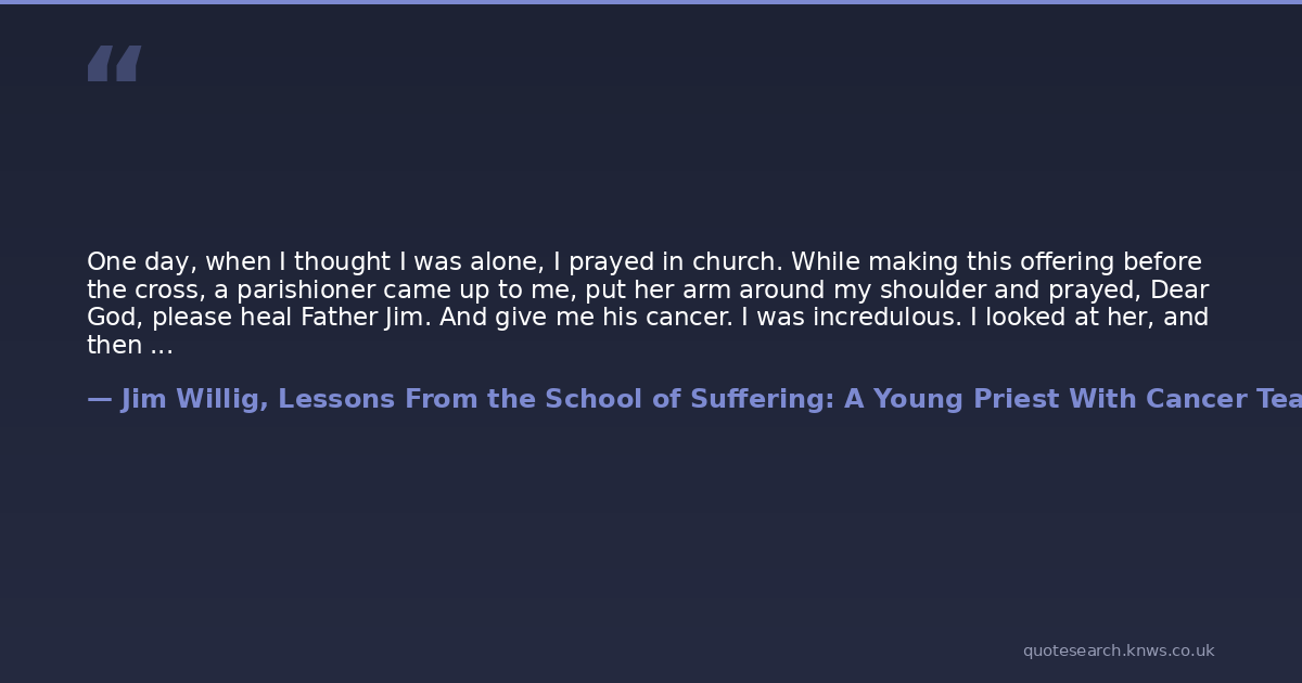 One day, when I thought I was alone, I prayed in church. While making this offering before the cross, a parishioner came up to me, put her arm around my shoulder and prayed, Dear God, please heal Father Jim. And give me his cancer. I was incredulous. I looked at her, and then back to the Lord and quietly prayed, If she insists, Lord, hear our prayer! Later I was able to pray, Lord, rather than give my cancer to her, give her heart of love to me the love that prompted her to deny her very self and pray in such a loving way.
