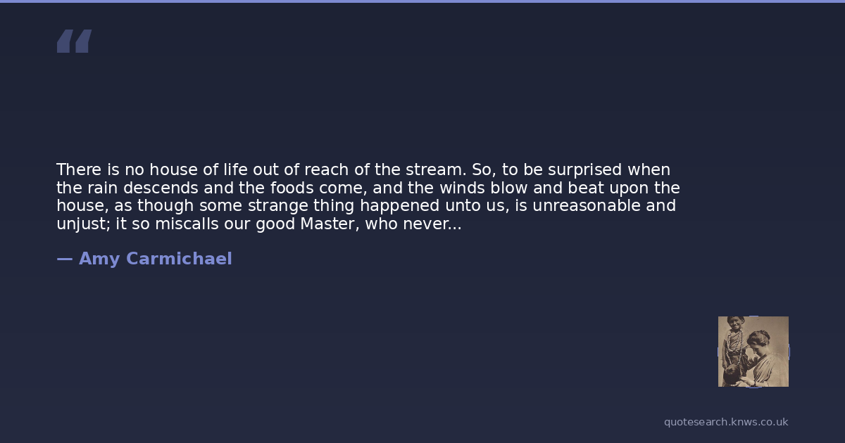 There is no house of life out of reach of the stream. So, to be surprised when the rain descends and the foods come, and the winds blow and beat upon the house, as though some strange thing happened unto us, is unreasonable and unjust; it so miscalls our good Master, who never told us to build for fair weather or even to be careful to build out of reach of floods. "We must through much tribulation enter into the kingdom of God" is not a fair-weather word. "My son, if thou comest to serve the Lord, prepare thy soul for temptation." "Ye will not get leave to steal quietly to heaven, in Christ's company, without a conflict and a cross." Even so, even though we must walk in the land of fear, there is no need to fear. The power of His resurrection comes before the fellowship of His sufferings.