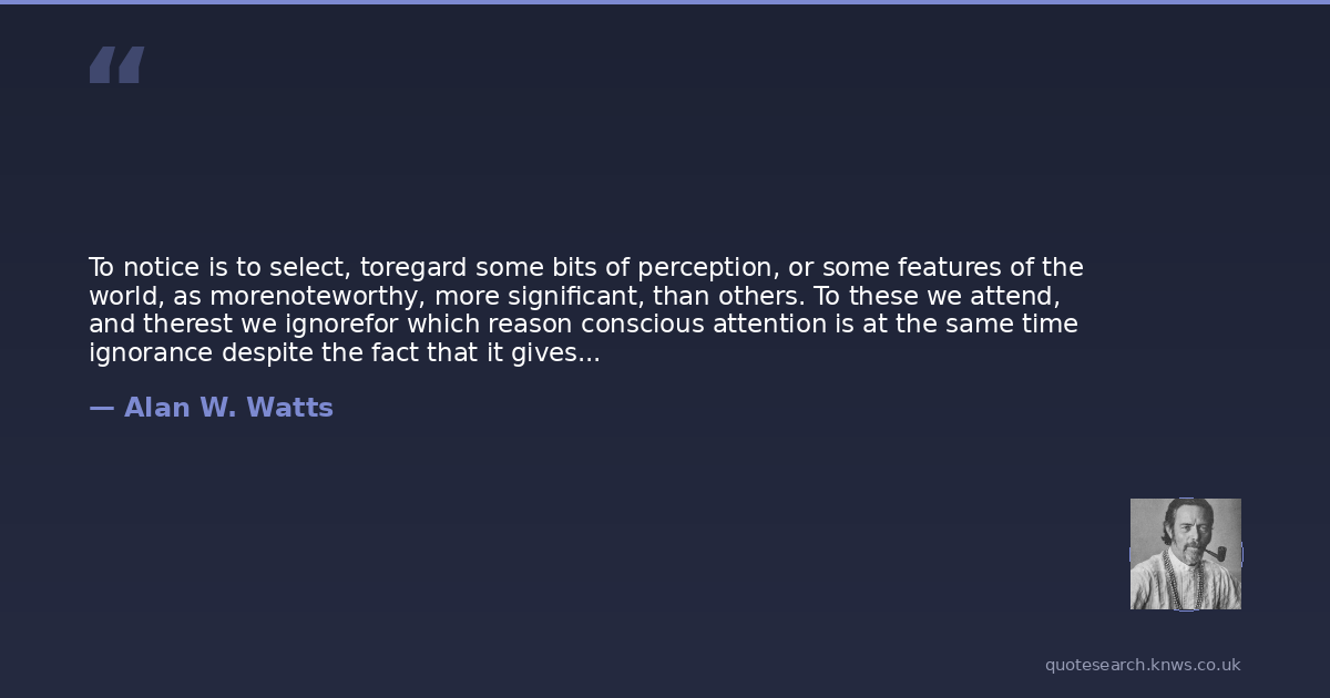 To notice is to select, toregard some bits of perception, or some features of the world, as morenoteworthy, more significant, than others. To these we attend, and therest we ignorefor which reason conscious attention is at the same time ignorance despite the fact that it gives us a vividlyclear picture of whatever we choose to notice.