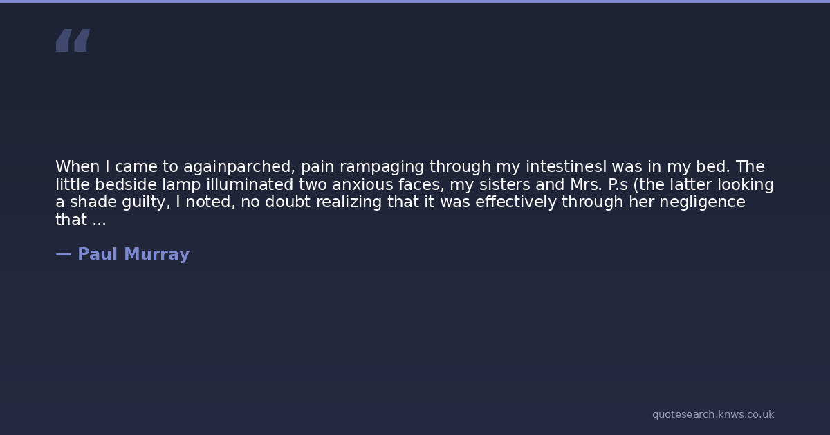 When I came to againparched, pain rampaging through my intestinesI was in my bed. The little bedside lamp illuminated two anxious faces, my sisters and Mrs. P.s (the latter looking a shade guilty, I noted, no doubt realizing that it was effectively through her negligence that I had been forced to poison myself) [. . .] I think he has eaten many kidney beans. Mrs. P. shuddered. Many kidney beans not cooked. Beans! I cried again deliriously. Oh for heavens sake, Bel said. Charles, listen carefully, did you soak the beans before you cooked them? Of course I didnt soak them, I said. What are you talking about?
