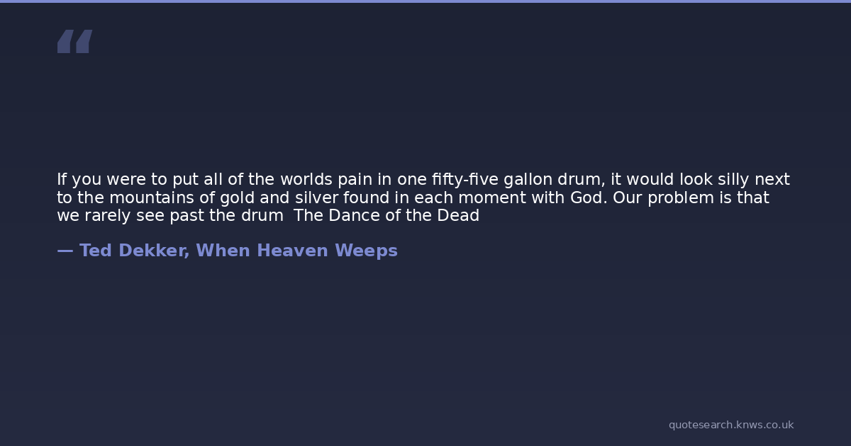 If you were to put all of the worlds pain in one fifty-five gallon drum, it would look silly next to the mountains of gold and silver found in each moment with God. Our problem is that we rarely see past the drum The Dance of the Dead