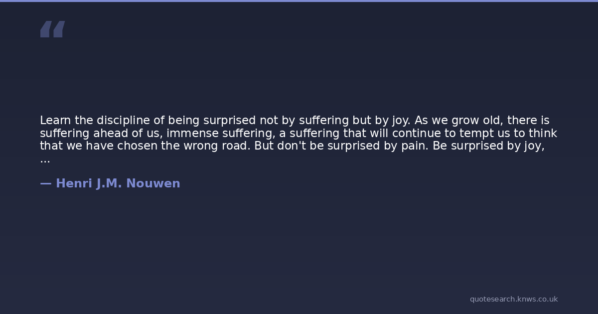 Learn the discipline of being surprised not by suffering but by joy. As we grow old, there is suffering ahead of us, immense suffering, a suffering that will continue to tempt us to think that we have chosen the wrong road. But don't be surprised by pain. Be surprised by joy, be surprised by the little flower that shows its beauty in the midst of a barren desert, and be surprised by the immense healing power that keeps bursting forth like springs of fresh water from the depth of our pain.