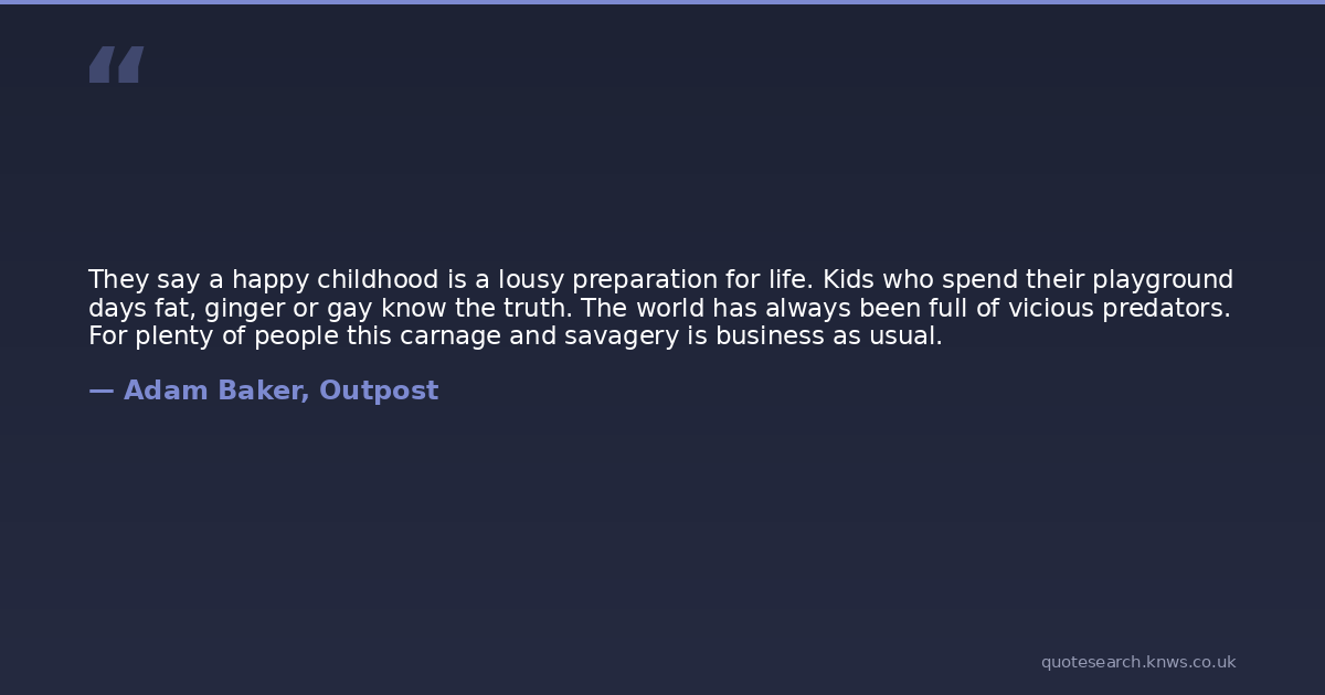 They say a happy childhood is a lousy preparation for life. Kids who spend their playground days fat, ginger or gay know the truth. The world has always been full of vicious predators. For plenty of people this carnage and savagery is business as usual.