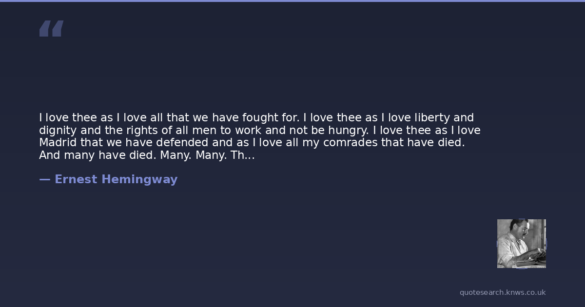 I love thee as I love all that we have fought for. I love thee as I love liberty and dignity and the rights of all men to work and not be hungry. I love thee as I love Madrid that we have defended and as I love all my comrades that have died. And many have died. Many. Many. Thou canst not think how many. But I love thee as I love what I love most in the world and Ilove thee more.
