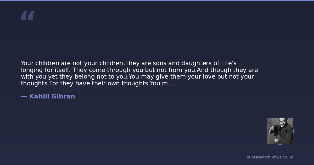 Your children are not your children.They are sons and daughters of Life's longing for itself. They come through you but not from you.And though they are with you yet they belong not to you.You may give them your love but not your thoughts,For they have their own thoughts.You may house their bodies but not their souls,For thir souls dwell in the house of tomorrow, which you cannot visit, not even in your dreams.You may strive to be like them, but seek not to make them like you.For life goes not backward nor tarries with yesterday.You are the bows from which your children as living arrows are sent forth.The archer sees the make upon the path of the infinite, and He bends you with His might that His arrows may go swift and far.Let your bending in the archer's hand be for gladness.For even as He loves the arrow that flies, so He also loves the bow that is stable.