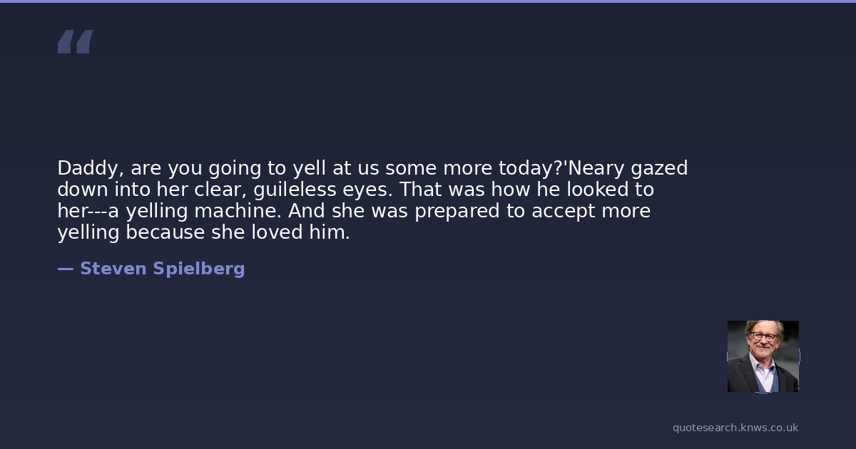 Daddy, are you going to yell at us some more today?'Neary gazed down into her clear, guileless eyes. That was how he looked to her---a yelling machine. And she was prepared to accept more yelling because she loved him.