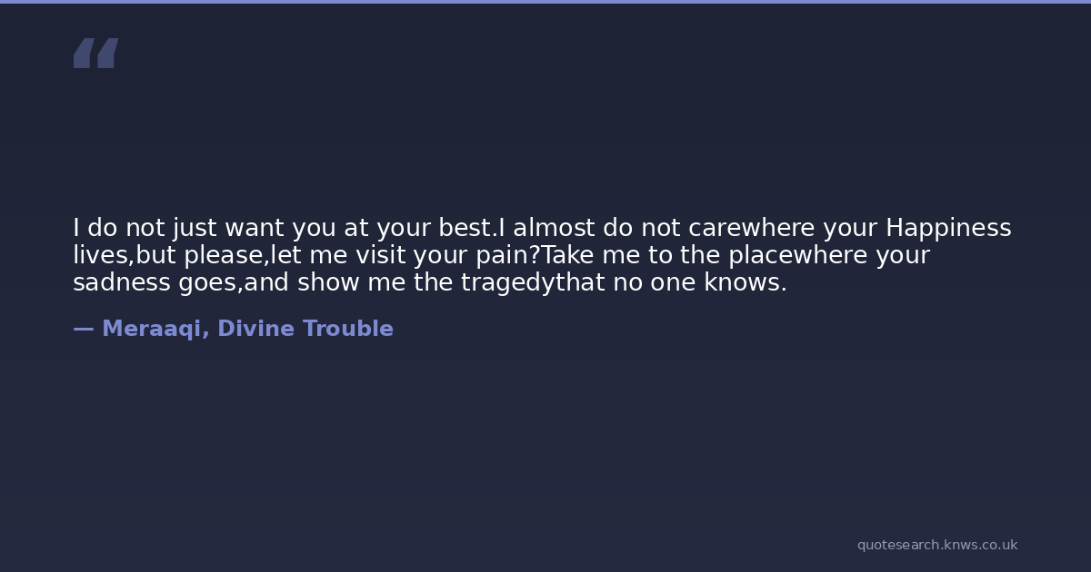 I do not just want you at your best.I almost do not carewhere your Happiness lives,but please,let me visit your pain?Take me to the placewhere your sadness goes,and show me the tragedythat no one knows.